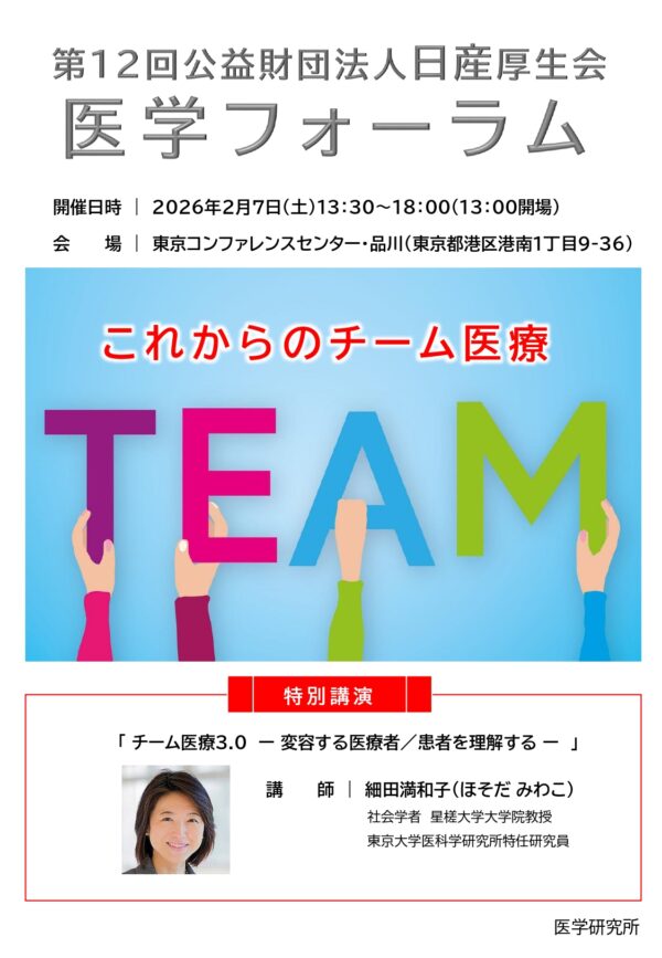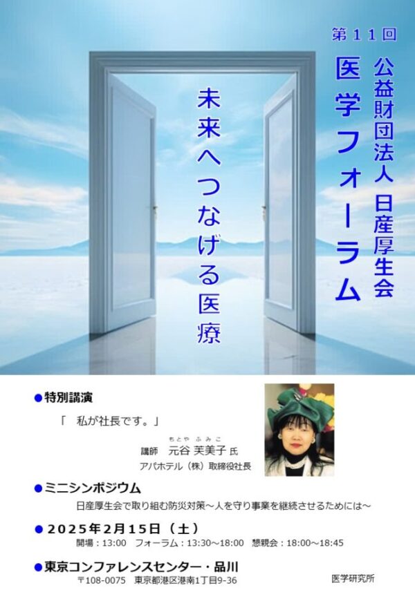 2025年10月03日 | 日産厚生会第12回医学フォーラム開催のお知らせ第12回医学フォーラムを以下の通り開催いたします。 日 時 2026年2月7日(土)13:30~18:00(13:00開場) |